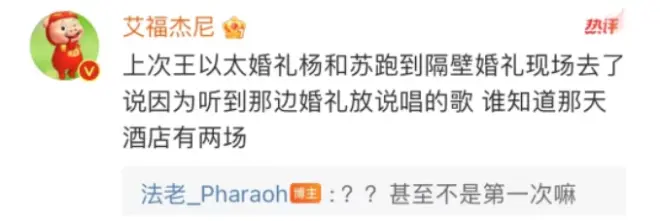 艾福杰尼还爆料杨和苏当年参加闪火婚礼的时候,因为闪火婚礼的隔壁也在办婚礼,还放了说唱,杨和苏就走错了哈哈哈哈哈。