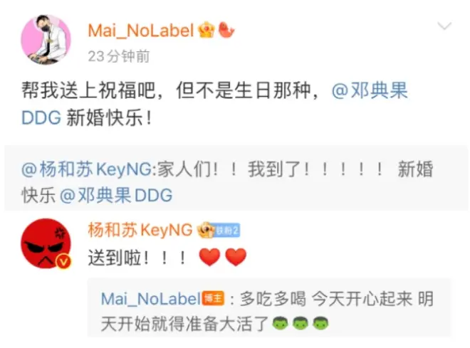 JarStick上一秒还祝福邓典果两口子新婚快乐百年好合。