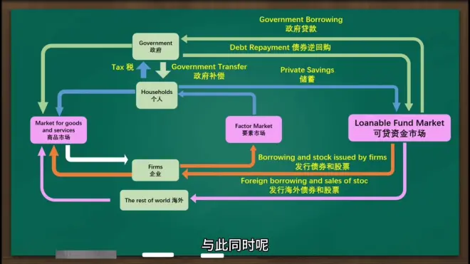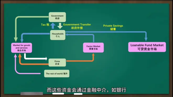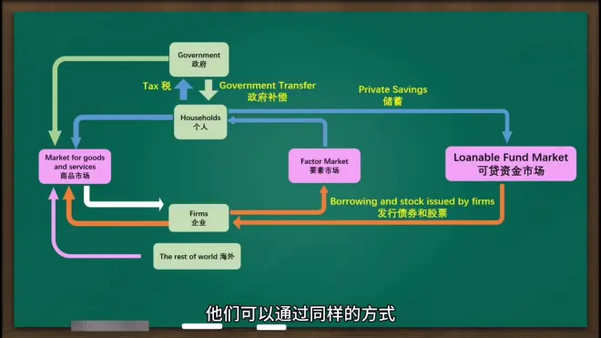 除了交税消费之外,个人也会把收入存起来,所有这笔存款会流到financial market。在经济学中,除了商品市场和要素市场外,还有金融市场,也叫做可贷资金市场:这是一个为借款者和贷款者提供资金借贷的市场。