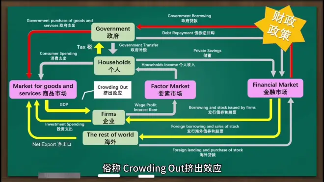 而金融市场资金总量不变的情况下,政府借款量的增加会导致国内企业和海外企业的借款量下降,从而影响到了投资支出和进出口额。