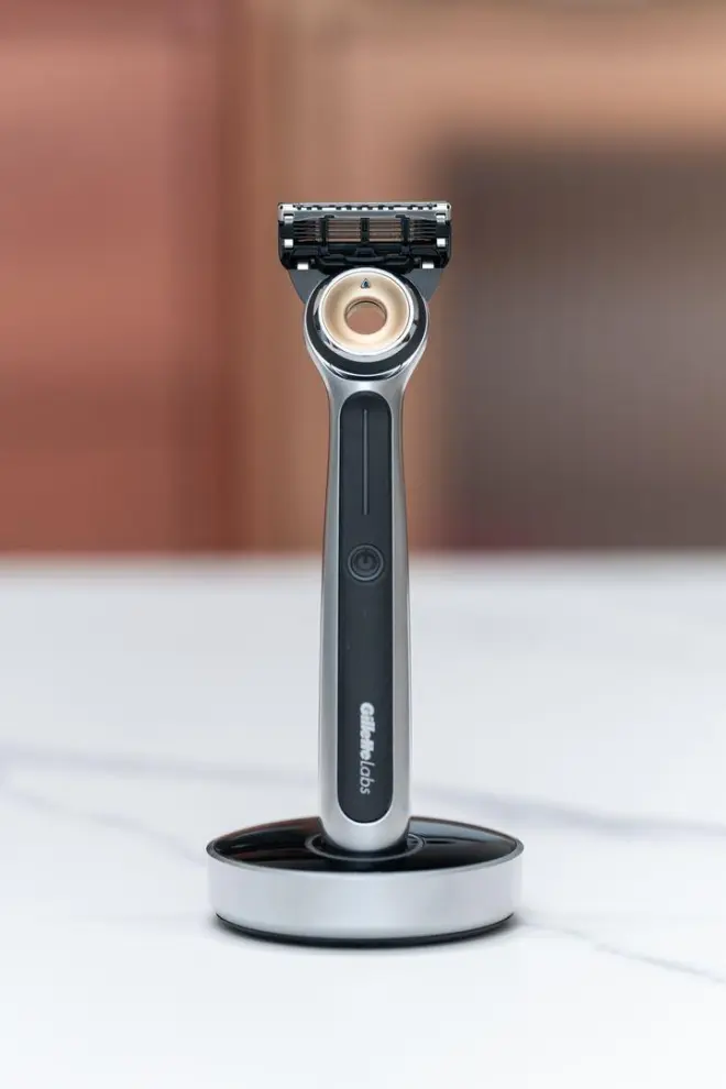 从产品外观来看,吉列 LABS 热感剃须刀是最结实也是颜值最高的一款,它的背面造型有点像极光系列的放大版,但有所区别的是热感系列中部设计了一个长条形的电源指示灯和圆形按键,同时黑色的磨砂区域更大,底部则是一个支持无线充电的磁力底座。