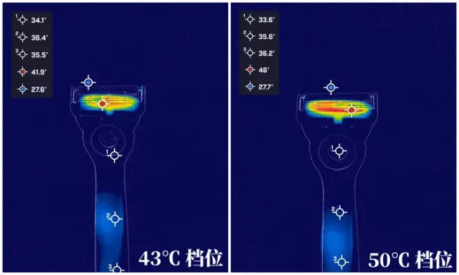 通过红外热成像仪可以看到,吉列热感剃须刀在开启后 1 秒内就迅速从常温状态升温至 45℃ 左右,并且还是智能恒温状态。如果一会温热一会过热,用户感受肯定不行,所以这种体验细节都得到了兼顾。