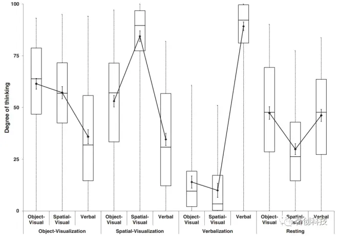 方差分析显示,条件对物体视觉、空间视觉和言语思维有显著影响。图4显示了四种条件下物体视觉、空间视觉和言语思维的自我报告程度。事后检验显示,在每项任务(物体可视化、空间可视化和语言化)中,参与者在诱发模式下比在其他模式下思考得更强烈。这在语言化任务中最为突出(图4)。
