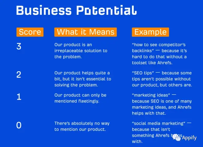 在Appify,我们为每个主题分配一个“商业潜力”分数。商业潜力是在涵盖给定关键字的同时推销你的产品是多么容易。这是我们使用的“备忘录”: