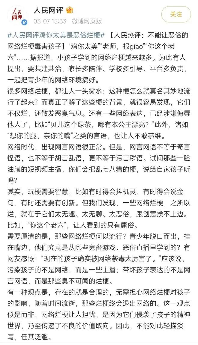 2023年3月7日,人民网评发布视频,称“对待网言网语我们秉承开放的心态,但反对 ’鸡你太美‘’老师,报giao’‘你这个老六‘等烂梗,反对乌烟瘴气的网络表达。我们欢迎那些充满机趣、活泼生动的网言网语,但是对恶俗烂梗、污秽表达必须坚决说不”。这条视频很快就传遍了全网(最初是我爸在w信视频号上看到了给我看我才知道的),引发大量网友热议。在官方新闻的评论区里,有许多赞同此做法的人批评鸡你太美和其他梗;“黑色的铁粉们”也抒发了自己的观点:鸡你太美不是烂梗,而且也没有视频所说那么严重。