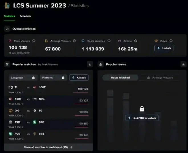 最近电竞相关统计数据供应商Esports Charts发布了一项最新数据显示,可以看到LCS北美赛区夏季赛揭幕战C9和GG的对决,最终只吸引了77000名观众,相比上赛季直接少了10万的观赛人数,真的是一半都不到。