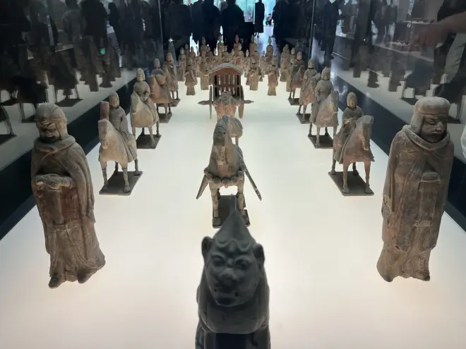 北魏墓葬出土的仪仗俑群。对我而言,提到“洛阳”和“俑群”,能想到的当然是标志性的唐三彩;所以看到属于北魏时代就有规模如此之大的一组俑群,我的第一反应是有些震惊的。这组俑群包括马车俑、骑马俑以及后续的文武百官,造型非常细致且生动,足以体现当年定都洛阳的北魏在手工业方面已经有了相当的发展高度。