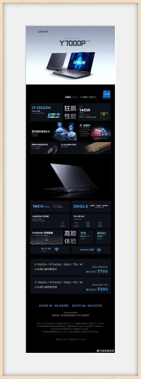 联想拯救者 Y7000P 2023 笔记本新配置开卖:i7-13620H + RTX 4060,7499 元