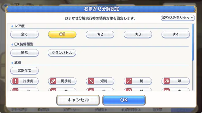 点击「おまかせ装備」后,设定指定的条件,点击「OK」,即可快速装备EX装备!