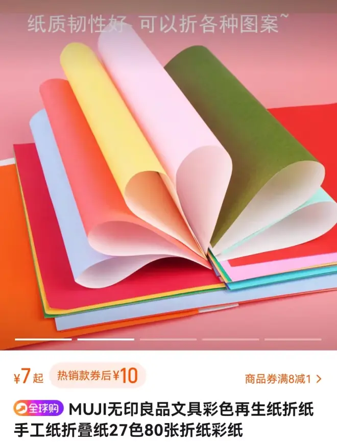 新手在专业的折纸网店里挑选是一个比较稳妥的做法。新开的店我不太清楚,在橙色软件里,心有纸艺或者槑的玫瑰小屋都是比较靠谱的折纸店,但一般都不包邮。所以我更推荐先去买一包无印良品的再生纸,简单尝试一下基础的折纸作品,有一定的兴趣想要深入研究的时候再去网店采购用纸也不迟。A4可以使用,但不堪大用,经济和自主条件允许的话,10块一包的muji纸就能极大地改善折纸体验了。