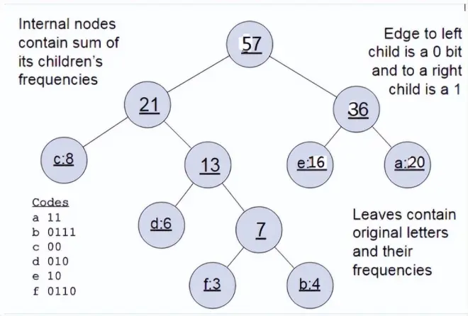 一般对于一个霍夫曼树的节点(根节点除外),可以约定左子树编码为0,右子树编码为1.如上图,则可以得到c的编码是00。