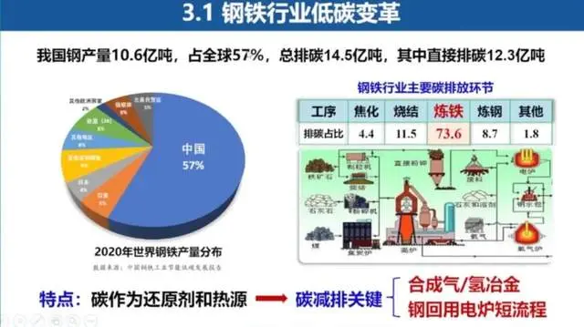 整个体系的变革就是要从原来的热碳驱动改成电氢驱动,原来用碳还原的过程要改成用氢或电来还原。比如氧化铁由碳来还原会产生二氧化碳,改成用氢还原或者用电还原,就可以避免二氧化碳的产生。