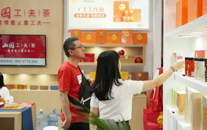 山国工夫茶作为高端茶礼领军品牌,展厅延续一贯以来简单时尚的设计风格,成为展会一道靓丽的风景线,吸引了现场众多观众纷纷前来打卡。