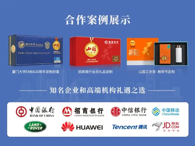 山国工夫茶以丰富的产品线、高效完善的服务流程、强大的供应链体系、以及创意满满的设计团队,服务了包括中国银行、中国移动、华为、路虎等在内的众多行业头部客户。