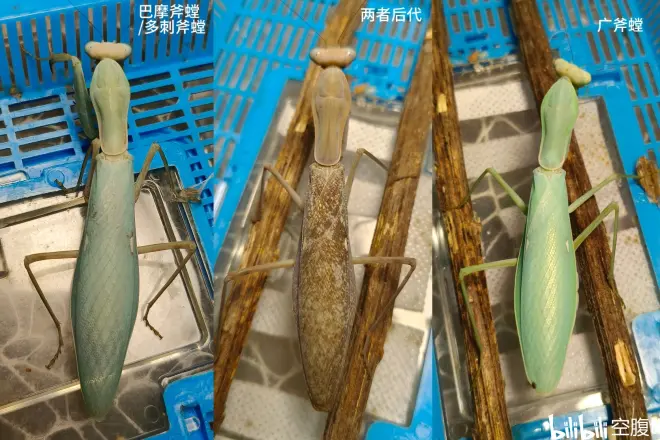 以上对比个体 巴摩斧螳第三代人工个体,体长8.2cm 混血斧螳野血个体,体长7.9cm 广斧螳野血个体,体长7.5cm