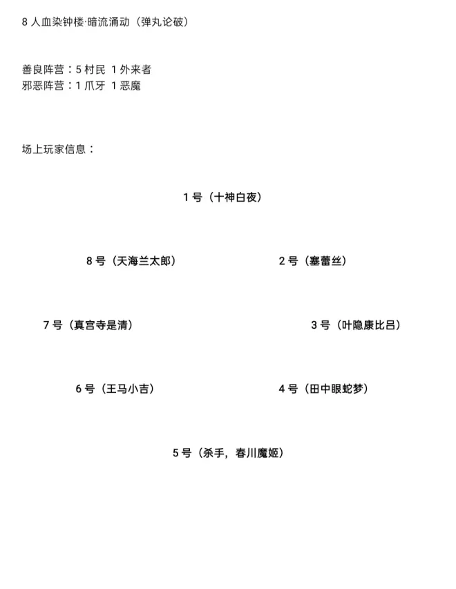 8号(天海兰太郎,CO图书管理员):哈,真巧啊王马,现在我可以说明了,昨晚说书人给我的酒鬼位——刚好就是1号和你6号啊!