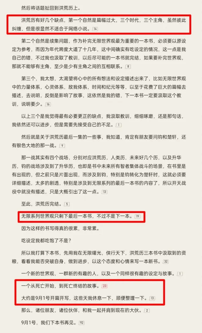 此外无限系列还有一部作品要写,不过要在以后了。他的下本小说已经确定九月一号开写,会是新的故事,准备来验证他自己是否真能突破自我,继续成长的,大家或许可以期待一下。