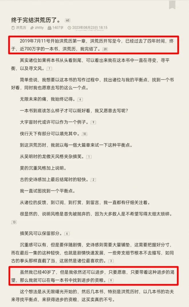 所以从2019年7月上线到现在2023年8月落幕,四年一个月他也写了近七百万字,还是不少的,这也成了他作品里字数最多的一本。