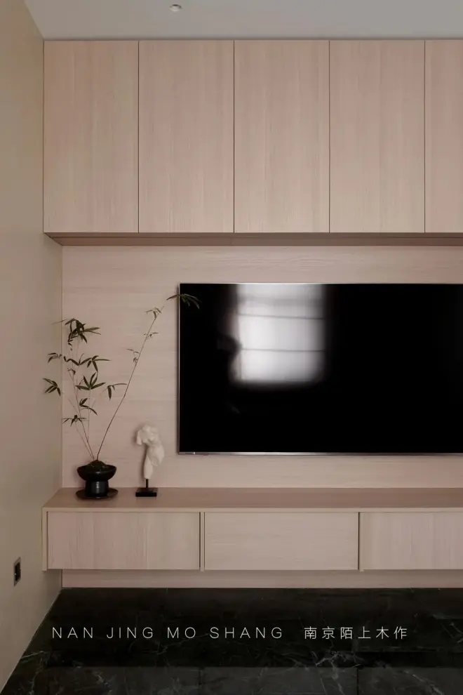 电视柜填补了原始墙面结构,将立面趋于统一,张弛有度的柜体增强收纳形式的同时提升了空间的呼吸感,素雅的颜色和质朴的纹理为居住者建立起一份淡然于心的安谧。