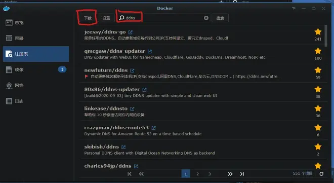 Docker注册表中搜索ddns,选中jeessy/ddns-go,点击下载。