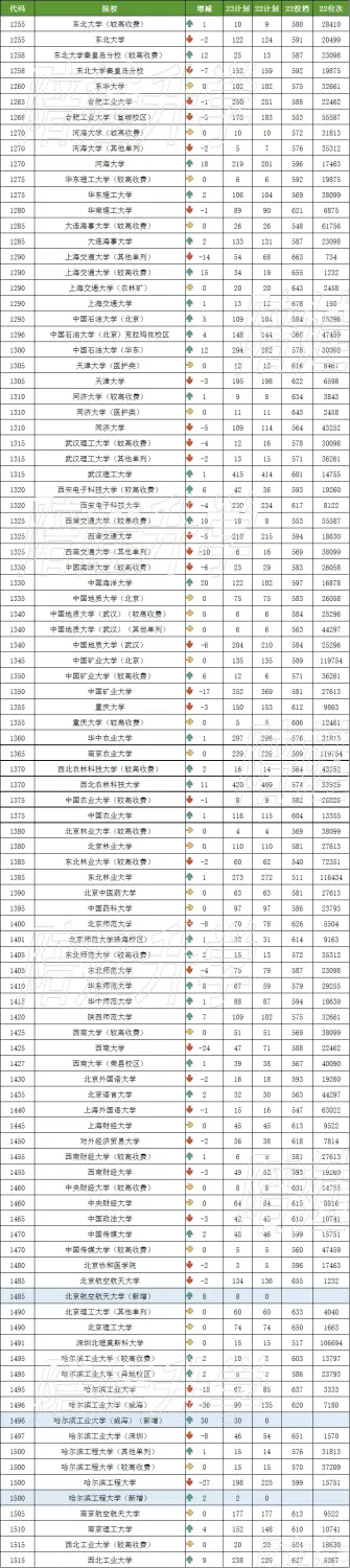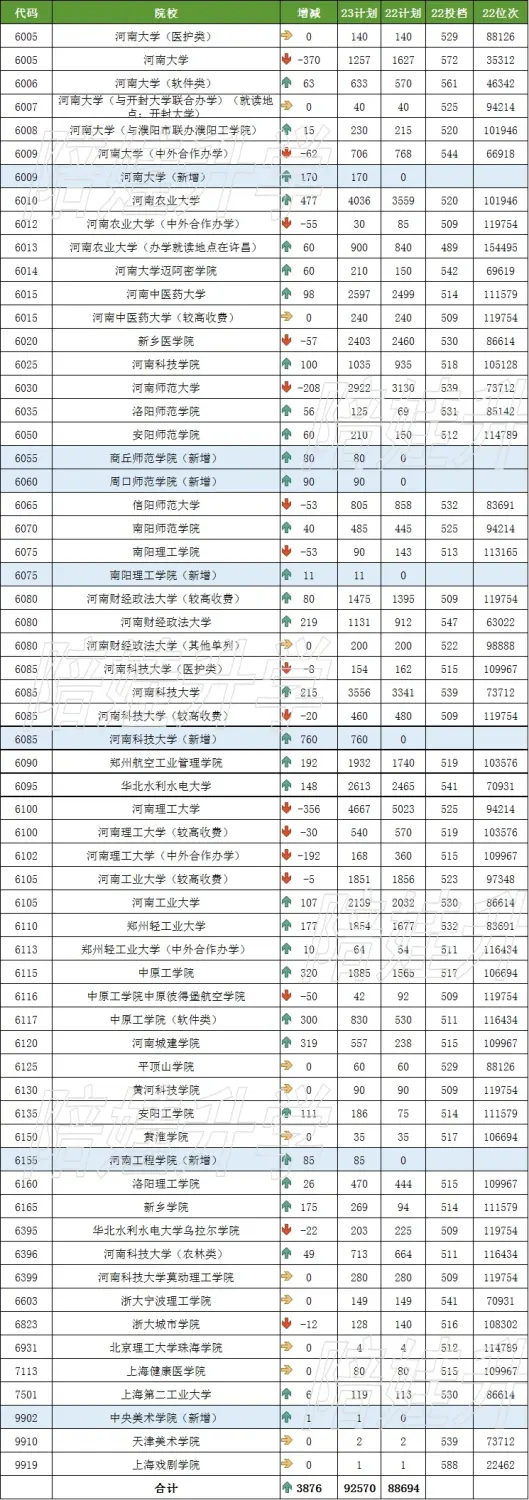全国高校2023年本科一批二批在河南招生计划、投档分与位次与上年对比变化较大