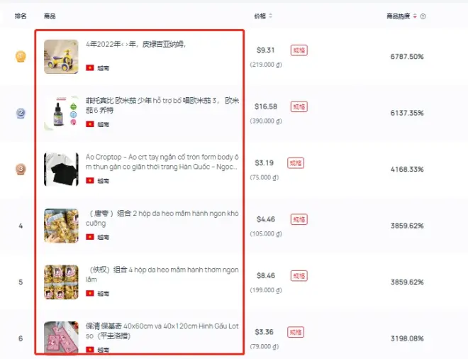 【热推商品榜】:这些产品的营销热度飞快上升,很多人在关注具有潜在机会的商品。儿童玩具和服装、零食饼干成为了越南近一周的热推商品。