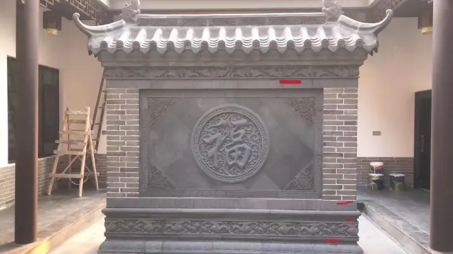 不同样式的影壁墙也可以呈现出不同的视觉效果,但是作用都是一样的。福字影壁墙是最受自建房使用的一款砖雕,不仅是寓意吉祥幸福,而且做工精美,图案立体生动。