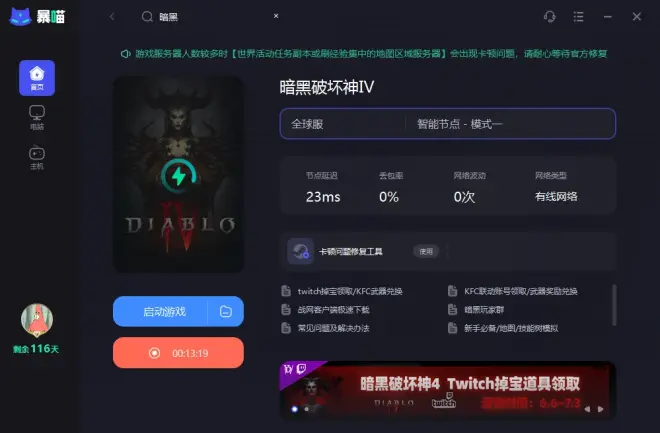 由于暗黑破坏神4所有的服务器都架设在国外,不论是网络还是服务器都会存在不稳定的问题,使用暴喵加速器可以优化网络连接,提高网络连接速度,并帮助玩家稳定与服务器之间的连接,克服网络不稳定的游戏无法找到有效许可证书或无法连接服务器的问题。在暴喵客户端搜索框输入“暗黑4”选择适合您的节点,加速游戏连接,在游戏中享受更加流畅的体验。
