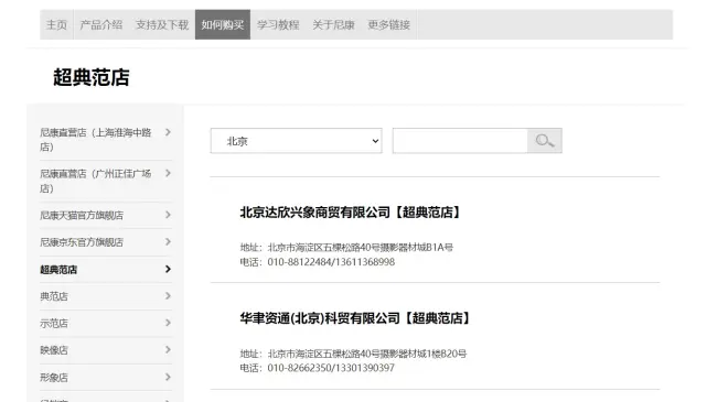 这里可以根据自己所在地区筛选尼康认可的线下实体店,包括地址、联系电话、店铺名称等信息。