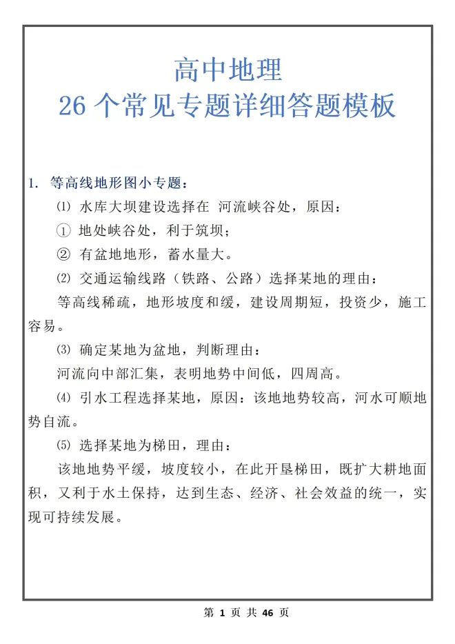 大家好,前几天给大家整理了其他科的笔记,今天我们来说说地理。 对于高中地理,很多同学说不仅要背诵,而且还要计算,知识太杂了记不住。对于文科生来说,背诵地理要比历史难,历史可以按照时间轴的顺序,记住时间的主线,就可以了,但是地理却不行。 那么如何才能更好地复习地理呢?今天来看看学霸是怎么学习的,今天给大家整理了《高中地理26个常见专题详细答题模板》进行汇总,答题模板复习背这一份就够了!!!