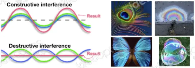 自然界的许多色彩来自薄膜反射的干涉作用,例如,孔雀的羽毛在不同角度下会呈现出不同的颜色。这是由于其表面有多层次的微纳结构,在一定角度上,从表面反射的光进行相长干涉,而在其他角度,光进行相消干涉。因此,人们就可以观察到这种颜色随角度变化的现象,如图1所示。