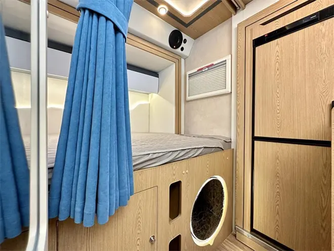 干湿一体式卫浴间内匹配智能马桶、MAX换气扇、顶部储物柜、侧窗、独立淋浴系统,固定的洗漱台和洗脸盆设计提升了整体的质感,为车友带来舒适的使用体验。水路方面配有外置160L净水箱,内置170L净水箱均采用医用级不锈钢,水路系统方面还带有低温自动排水功能,更加智能化!