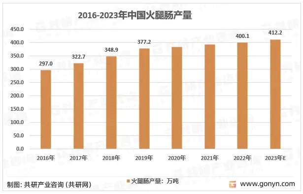火腿肠以其方便、美味、保质期长等优点,必将依旧成为中国近阶段肉制品的主导产品。受益于市场需求的增长,我国火腿肠产量不断增加,2023年我国火腿肠产量可达412.2吨。