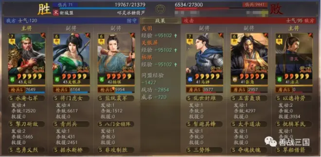 战法替换:老关羽可以千里+拒水,青州+拒水,关妹带忠勇+破军,SP关羽也可以带忠勇+威谋,或者青州+拒水打辅助让关妹忠勇+破军打伤害。