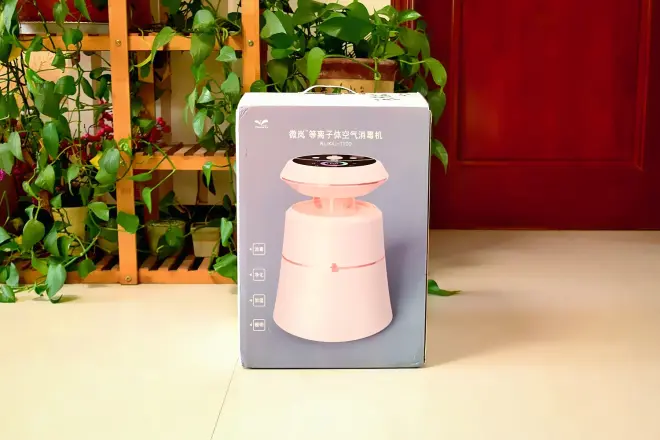 微岚空气消毒机采用环保纸质包装盒,正面是产品实物图和名称,侧面印有关于产品的特色功能介绍,在顶部还有个塑料提手,更方便用户提起移动。