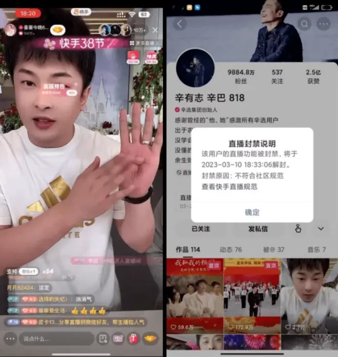 叫嚣全网、对峙官方、直播间被封、含泪回归,这一套模式已经成为了辛巴的标准化出圈组合拳。屡次被封、屡次道歉、屡次不改,如此往复,辛巴在快手站内地位依旧稳固。