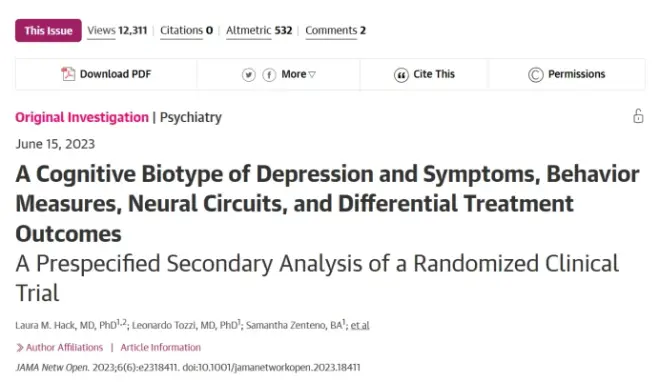 重度抑郁症(MDD)是一种严重的、通常表现为慢性进展的疾病,具有惊人的负担,会破坏社会心理、人际关系和工作场所。认知障碍被认为是使用抗抑郁药物后导致功能不良和缺乏症状缓解的主要原因。近日发表于JAMA Network Open(美国医学会杂志网络公开版)的题为“A Cognitive Biotype of Depression and Symptoms, Behavior Measures, Neural Circuits, and Differential Treatment Outcomes:A Prespecified Secondary Analysis of a Randomized Clinical Trial”的报告,通过对一项International Study to Predict Optimized Treatment in Depression的随机临床试验进行的二次分析,实现了对抑郁症认知生物型的神经环路、症状、社会职业功能和结果进行系统的效度检验。