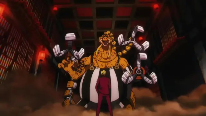 宴会厅的战斗还在持续当中,百兽海贼团与武士军团正在混战,不过他们的战斗只是小打小闹。干部之间的对决才是最重要的,目前只剩下山治,索隆与三灾的对战。山治已经觉醒了血统因子,他的身体变得很奇怪,刀枪不入,疫灾奎因的攻击根本伤不了山治。