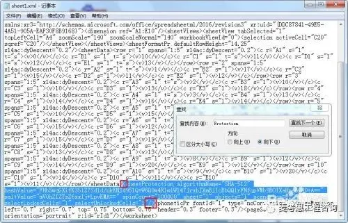 然后我们在记事本中按“Ctrl+F”调出查找窗口输入Protection然后点击查找,点下一个,则会定位至 <SheetProtection ...... > 中代码。选中的该部分代码进行删除(如何判断这个区域呢,就是SheetProtection所在的大于号与小于号的之间区域)。 (注意不要选错范围,也可以自己做个文件试试)。