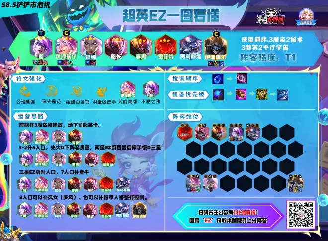 超英EZ这套阵容目前可玩的依据就是有魔盗的上限,D出三星多后期强度也是够的。