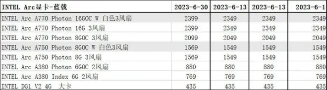 显卡的型号价格按顺序是:INTEL卡:A770 16G、A770 8G、A750 8G、A380 6G、DG1 4G。