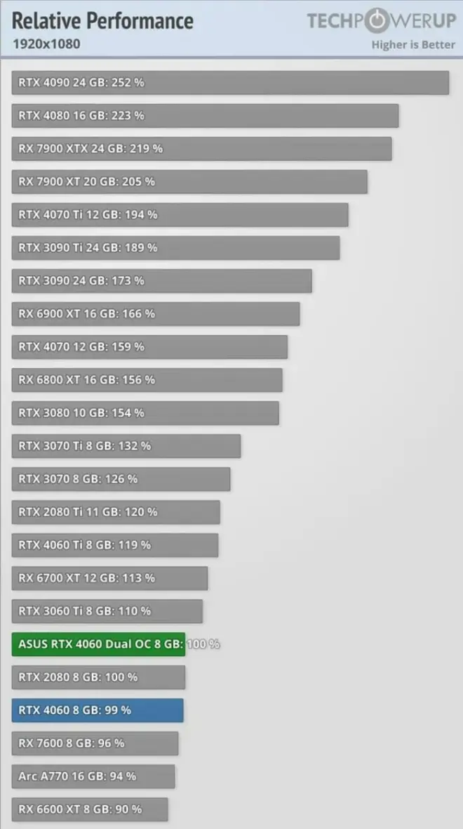 RTX4060在1080P分辨率下仅仅能打得过RTX3060和RX7600,性能低于RTX3060TI。目前的价格并不是很值得入手。