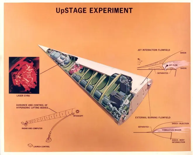 UPSTAGE 项目于 1968 年开始,致力于研究拦截机动房车的第二级。UPSTAGE 的第一级使用了 HIBEX项目的研究成功 。UPSTAGE 的研究工作涵盖了第二级分离、控制系统、推力矢量控制生成技术和机制、制导、空气动力学、结构和通信。UPSTAGE 载具的设计具有“提升”空气动力学特性。一个重要的新制导功能是激光光学陀螺仪,它不需要“旋转”,并且部分是由 ARPA 资助开发的。