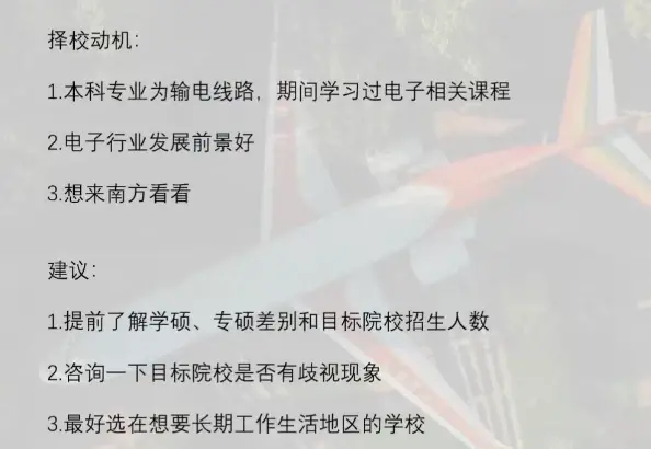 对于我本人来说,我算是三跨。跨地区,跨专业,跨学校。我本科的专业跟现在的专业也没有多大联系。主要是我对电子相关比较感兴趣。我感觉这个行业前景比较好。再是一直在北方生活,想来南方看看,这是我的择校动机。对于大家择校动机跟专业选择,我有下面三个建议。