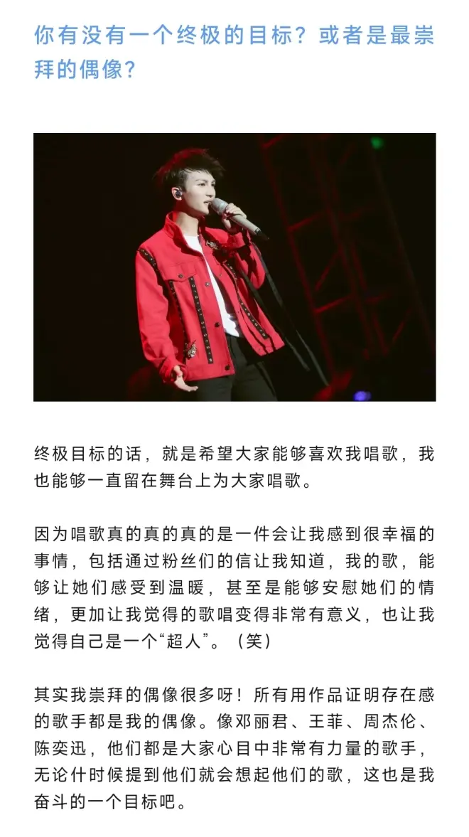 【转载文章】 2019.08.14 背后的宝藏男孩了解一下 http://t.cn/AiHIQTQM 「终极目标的话,就是希望大家能够喜欢我唱歌,我也能够一直留在舞台上为大家唱歌。」 「因为唱歌真的真的真的是一件会让我感到很幸福的事情,包括通过粉丝们的信让我知道,我的歌,能够让她们感受到温暖,甚至是能够安慰她们的情绪,更加让我觉得的歌唱变得非常有意义,也让我觉得自己是一个“超人”。(笑)」