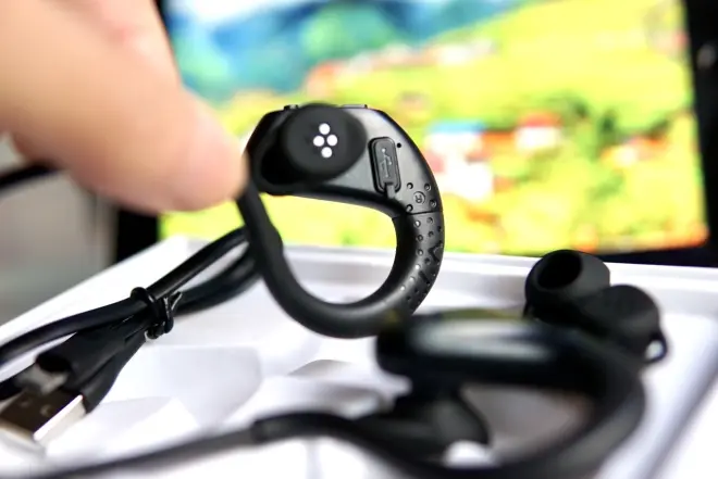 耳机的侧面是USB充电口。用厚厚的橡胶塞了起来,起到了防水的作用。充电口是Micro USB。一次充满的话续航可以长达8个小时。这款骨传导蓝牙耳机的版本是5.0,传输效率非常的高,有效距离是10米。