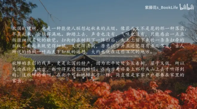 北国的槐树也是一种能使人联想起秋来的点缀,像花而又不是花的那一种落蕊,早晨起来会铺得满地,脚踏上去,声音也没有气味,也没有只能感出一点点极微细极柔软的触觉。扫街在扫街的在树影下,一阵扫后灰土上留下来,一条条扫帚的丝纹看起来既觉得细腻又觉得清润又觉得清闲又意识下,并且还觉得有点儿落寞。古人所说的梧桐一叶而天下之秋的瑶,遥想大约也就在这些深沉的地方,秋蝉的衰弱的残声更是北国的特产,因为北平处处全长着树,屋子又低,所以无论在什么地方都听得见它们的啼啼,在南方是非要上郊外或山上去才听得到的,这秋蝉的嘶叫在北平可和蟋蟀耗子一样,简直像是家家户户都养在家里的家虫