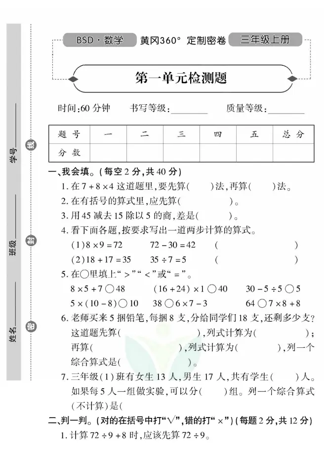 » 北师大上册3年级数学黄冈360°定制密卷