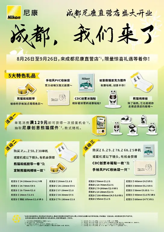 成都尼康直营店秉持 “创作者通道(CREATOR’S GATEWAY)”及“支持创作(EMPOWER TO CREATE)”的理念,精心打造了助力摄影爱好者体验产品的创摄空间。尼康衷心希望能借此机会让创作的乐趣为更多人所享,让创意灵感不断传递,推动影像文化的丰富发展!8月26日至9月26日,尼康与你一起相约成都,在光影缤纷中共度意义非凡的难忘时光。