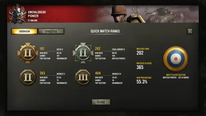 玩家档案是关于你的排名、统计数据和比赛的所有信息的全新重要功能。您可以在此处找到此功能的所有详细信息和一些附加预览:https://coh3.companyofheroes.com/player-profiles
